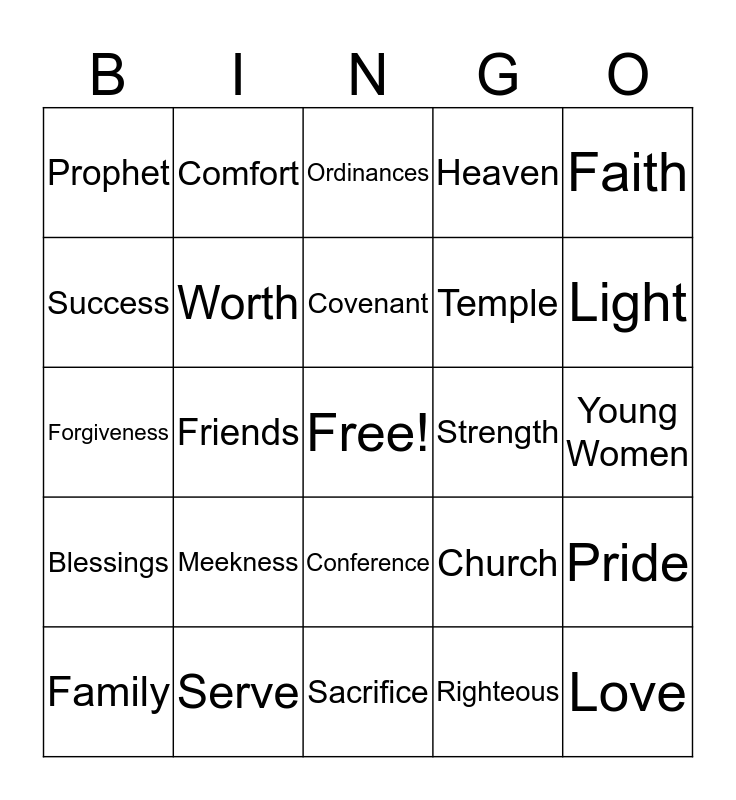 This bingo card has a free space and 25 words: Meekness, Sacrifice, Covenant, Family, Faith, Prophet, Success, Comfort, Strength, Conference, Temple, Forgiveness, Church, Pride, Worth, Doubt, Young Women, Ordinances, Light, Friends, Love, Serve, Blessings, Heaven and Righteous.
