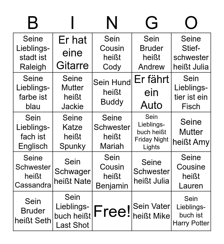 This bingo card has 31 words: Free!, Sein Lieblingsfach ist Mathe, Seine Katze heißt Spunky, Sein Bruder heißt Matthew, Seine Lieblings-stadt ist Raleigh, Sein Cousin heißt Cody, Seine Mutter heißt Jackie, Seine Schwester heißt Julia, Sein Lieblings-buch heißt Friday Night Lights, Sein Vater heißt Mike, Seine Mutter heißt Amy, Seine Schwester heißt Mariah, Sein Lieblings-buch ist Harry Potter, Seine Tante heißt Jenny, Sein Lieblings-tier ist ein Fisch, Sein Neffe heißt Benji, Seine Cousine heißt Lauren, Sein Schwager heißt Nate, Seine Schwester heißt Cassandra, Sein Cousin heißt Benjamin, Seine Stief-schwester heißt Julia, Sein Lieblingsgetränk ist Tee, Sein Bruder heißt Seth, Er hat eine Gitarre, Er fährt ein Auto, Seine Lieblings-farbe ist blau, Sein Bruder heißt Andrew, Sein Lieblings-fach ist Englisch, Sein Lieblings-buch heißt Last Shot, Sein Hund heißt Buddy and Seine Mutter heißt Elizabeth.