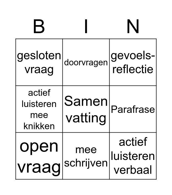 This bingo card has a free space and 8 words: Parafrase, gevoels- reflectie, doorvragen, open vraag, gesloten vraag, actief luisteren verbaal, actief luisteren mee knikken and mee schrijven.