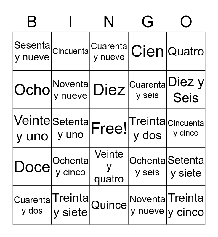 This bingo card has a free space and 24 words: Cuarenta y dos, Ochenta y cinco, Diez, Noventa y nueve, Quatro, Sesenta y nueve, Cincuenta, Cuarenta y nueve, Treinta y dos, Cincuenta y cinco, Veinte y uno, Noventa y nueve, Ochenta y seis, Setenta y siete, Ocho, Treinta y siete, Quince, Cien, Diez y Seis, Doce, Setenta y uno, Veinte y quatro, Cuarenta y seis and Treinta y cinco.