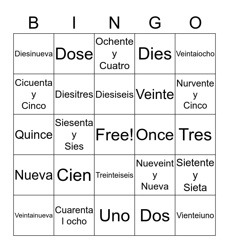 This bingo card has a free space and 24 words: Cien, Cuarenta I ocho, Diesiseis, Veintainueva, Veintaiocho, Diesinueva, Cicuenta y Cinco, Dose, Once, Treinteiseis, Veinte, Quince, Nueveint y Nueva, Sietente y Sieta, Diesitres, Dos, Tres, Ochente y Cuatro, Nurvente y Cinco, Siesenta y Sies, Vienteiuno, Nueva, Dies and Uno.