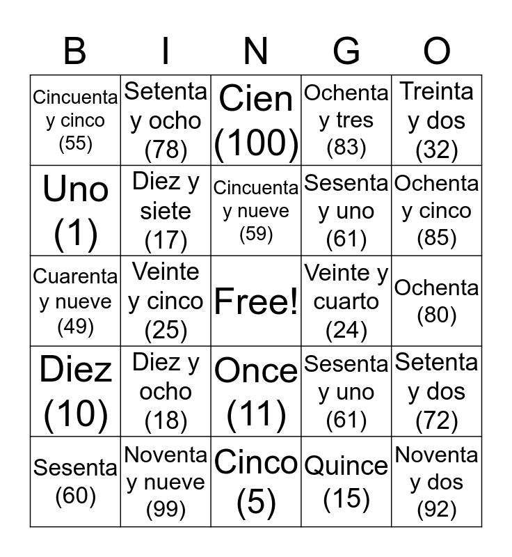 This bingo card has a free space and 24 words: Diez y ocho (18), Noventa y nueve (99), Cincuenta y nueve (59), Sesenta (60), Treinta y dos (32), Cincuenta y cinco (55), Uno (1), Setenta y ocho (78), Veinte y cuarto (24), Once (11), Sesenta y uno (61), Cuarenta y nueve (49), Sesenta y uno (61), Setenta y dos (72), Diez y siete (17), Quince (15), Ochenta (80), Cien (100), Ochenta y cinco (85), Veinte y cinco (25), Noventa y dos (92), Diez (10), Ochenta y tres (83) and Cinco (5).