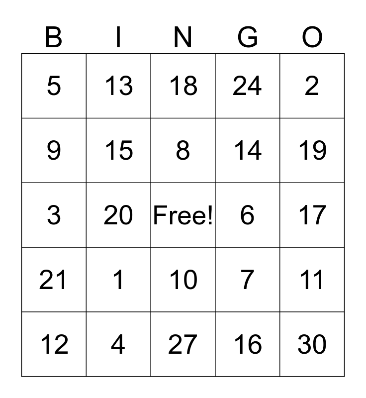 This bingo card has a free space and 24 words: 1, 4, 8, 12, 2, 5, 9, 13, 6, 10, 14, 3, 7, 11, 15, 16, 17, 18, 19, 20, 30, 21, 24 and 27.