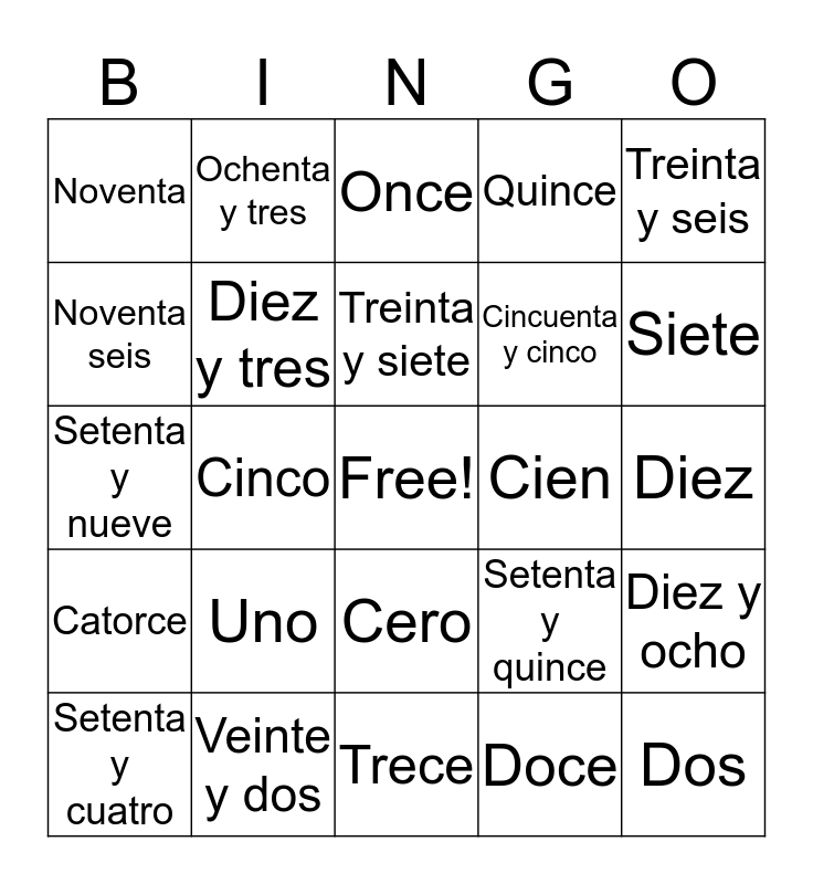 This bingo card has a free space and 24 words: Uno, Veinte y dos, Treinta y siete, Setenta y cuatro, Treinta y seis, Noventa, Noventa seis, Ochenta y tres, Cien, Cero, Cincuenta y cinco, Setenta y nueve, Setenta y quince, Diez y ocho, Diez y tres, Doce, Diez, Once, Siete, Cinco, Dos, Catorce, Quince and Trece.