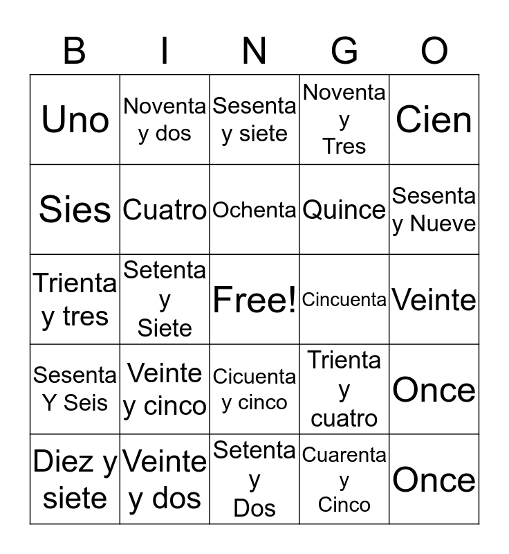 This bingo card has a free space and 24 words: Veinte y cinco, Veinte y dos, Ochenta, Diez y siete, Cien, Uno, Sies, Noventa y dos, Cincuenta, Cicuenta y cinco, Quince, Trienta y tres, Trienta y cuatro, Once, Cuatro, Cuarenta y Cinco, Veinte, Sesenta y siete, Sesenta y Nueve, Setenta y Siete, Once, Sesenta Y Seis, Noventa y Tres and Setenta y Dos.