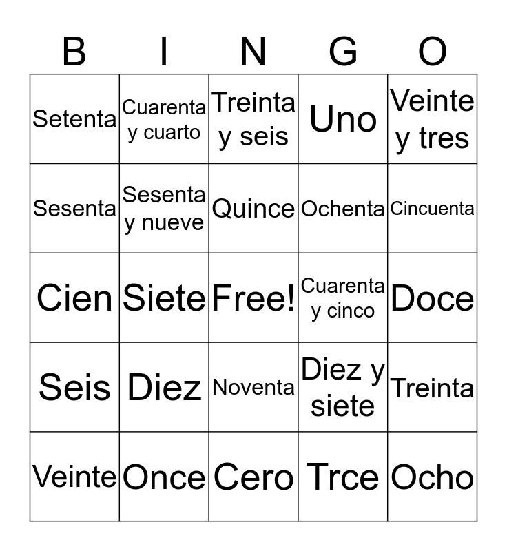 This bingo card has a free space and 24 words: Diez, Once, Quince, Veinte, Veinte y tres, Setenta, Sesenta, Cuarenta y cuarto, Cuarenta y cinco, Noventa, Ochenta, Cien, Diez y siete, Treinta, Sesenta y nueve, Trce, Doce, Treinta y seis, Cincuenta, Siete, Ocho, Seis, Uno and Cero.