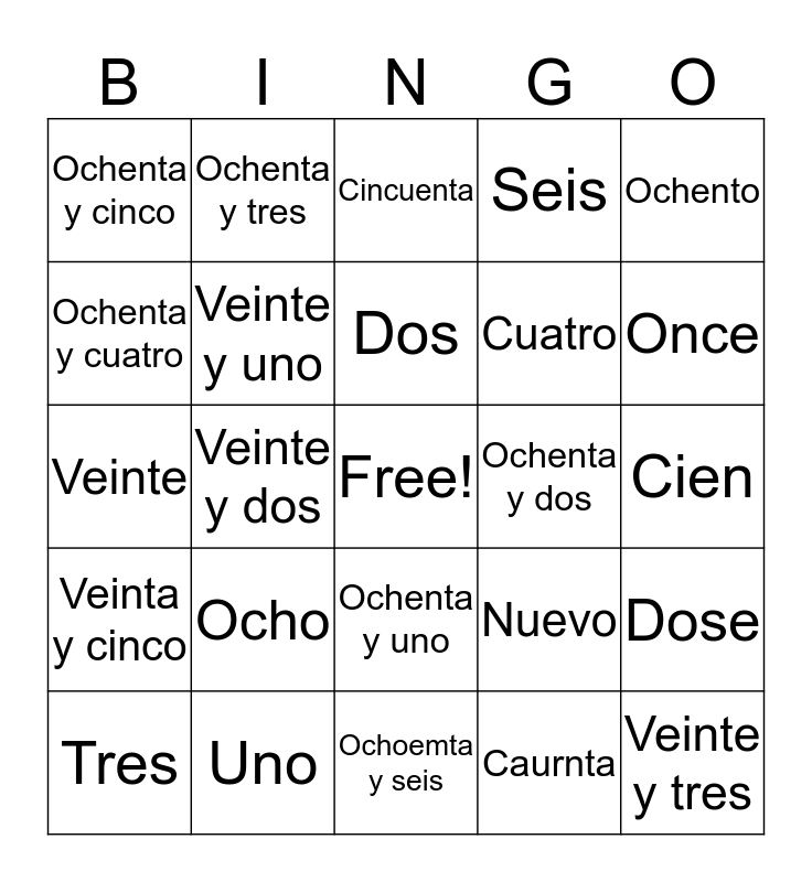 This bingo card has a free space and 24 words: Ocho, Uno, Dos, Tres, Ochento, Ochenta y cinco, Ochenta y cuatro, Ochenta y tres, Ochenta y dos, Ochenta y uno, Cuatro, Veinte, Nuevo, Dose, Veinte y uno, Caurnta, Cien, Cincuenta, Once, Veinte y dos, Veinte y tres, Veinta y cinco, Seis and Ochoemta y seis.
