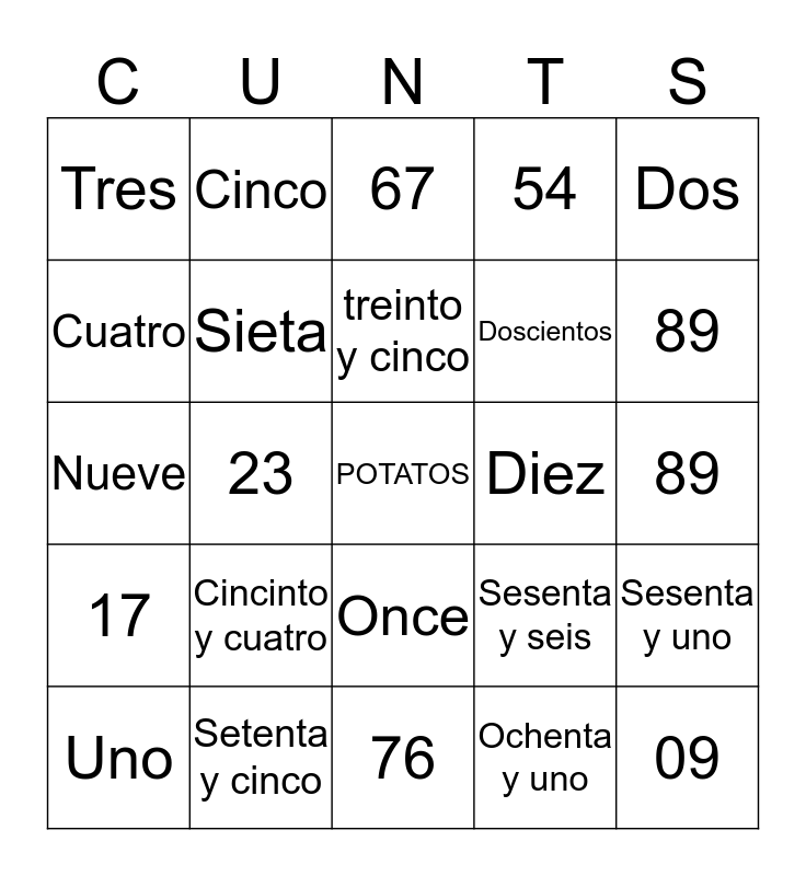 This bingo card has a free space and 24 words: Cincinto y cuatro, Setenta y cinco, treinto y cinco, Uno, Dos, Tres, Cuatro, Cinco, Diez, Once, Doscientos, Nueve, Sesenta y seis, Sesenta y uno, Sieta, Ochenta y uno, 89, 67, 89, 23, 09, 17, 54 and 76.