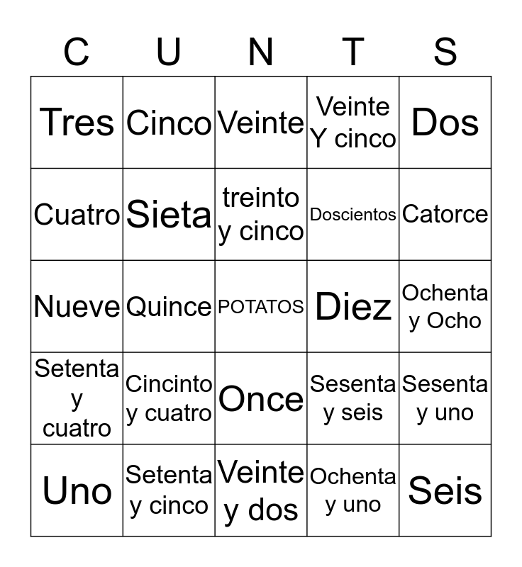 This bingo card has a free space and 24 words: Cincinto y cuatro, Setenta y cinco, treinto y cinco, Uno, Dos, Tres, Cuatro, Cinco, Diez, Once, Doscientos, Nueve, Sesenta y seis, Sesenta y uno, Sieta, Ochenta y uno, Ochenta y Ocho, Veinte, Catorce, Quince, Seis, Setenta y cuatro, Veinte Y cinco and Veinte y dos.