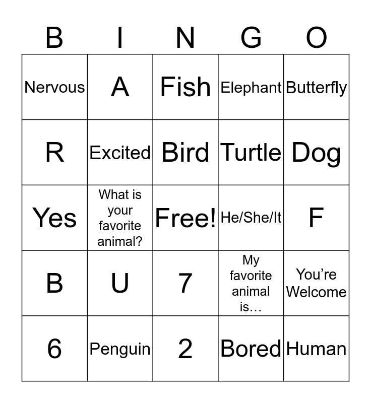 This bingo card has a free space and 109 words: I (me), You, He/She/It, We, They/Them, My, Your, Hers/ His, Our, Their, Hello, Goodbye, Thank you, Pet, Good, Bad, Yes, No, Sorry, Please, You’re Welcome, What’s your name?, My name is..., Animal, Bear, Bird, Butterfly, Cat, Cow, Crawfish, Dog, Elephant, Fish, Giraffe, Horse, Human, Lion, Monkey, Penguin, Pig, Rabbit, Shark, Turtle, What is your favorite animal?, My favorite animal is…, Do you have a pet?, I have a pet..., Happy, Mad, Stressed, Sad, Tired, Bored, Love, Hate, Like, Don’t like, Hungry, Confused, Excited, Nervous, Scared, Want, Sick, Jealous, Surprised, Worried, How are you?, How do you feel?, Are you ok?, I feel..., A, B, C, D, E, F, G, H, I, J, K, L, M, N, O, P, Q, R, S, T, U, V, W, X, Y, Z, 1, 2, 3, 4, 5, 6, 7, 8, 9, 10, Sea Turtle and Donkey/ Stubborn.