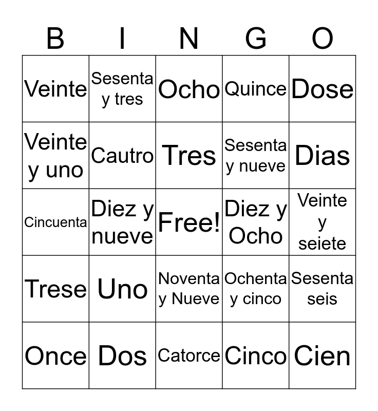 This bingo card has a free space and 24 words: Uno, Dos, Tres, Once, Dose, Veinte, Veinte y uno, Sesenta y tres, Diez y Ocho, Noventa y Nueve, Sesenta y nueve, Cincuenta, Ochenta y cinco, Sesenta seis, Cautro, Cinco, Veinte y seiete, Ocho, Dias, Diez y nueve, Cien, Trese, Quince and Catorce.