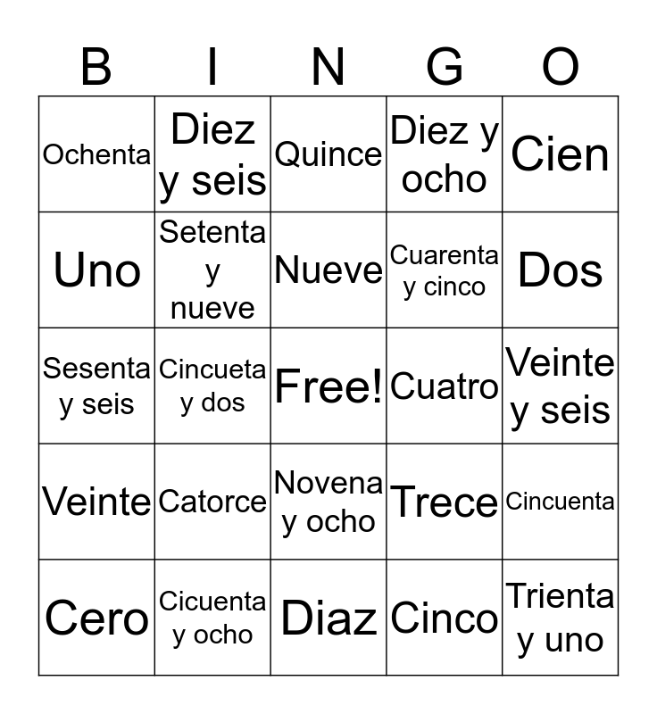 This bingo card has a free space and 24 words: Catorce, Cicuenta y ocho, Nueve, Cero, Cien, Ochenta, Uno, Diez y seis, Cuatro, Novena y ocho, Cuarenta y cinco, Sesenta y seis, Trece, Cincuenta, Setenta y nueve, Cinco, Veinte y seis, Quince, Dos, Cincueta y dos, Trienta y uno, Veinte, Diez y ocho and Diaz.