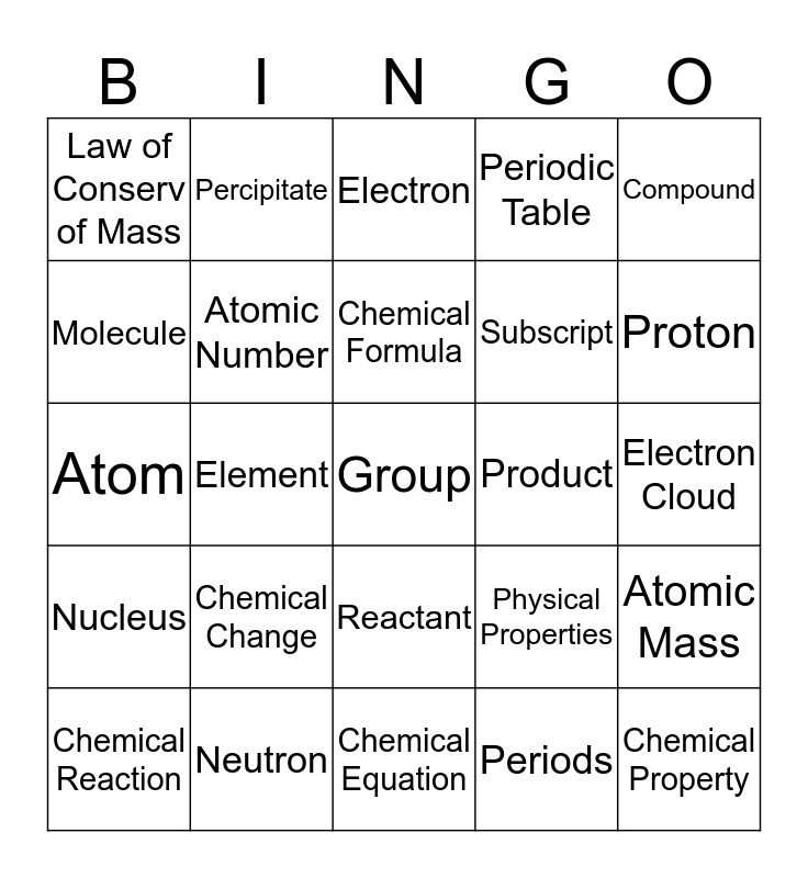 This bingo card has 25 words: Chemical Change, Chemical Equation, Chemical Formula, Chemical Reaction, Compound, Law of Conserv of Mass, Molecule, Percipitate, Product, Reactant, Subscript, Atom, Physical Properties, Atomic Mass, Atomic Number, Chemical Property, Electron Cloud, Electron, Proton, Element, Group, Neutron, Nucleus, Periodic Table and Periods.
