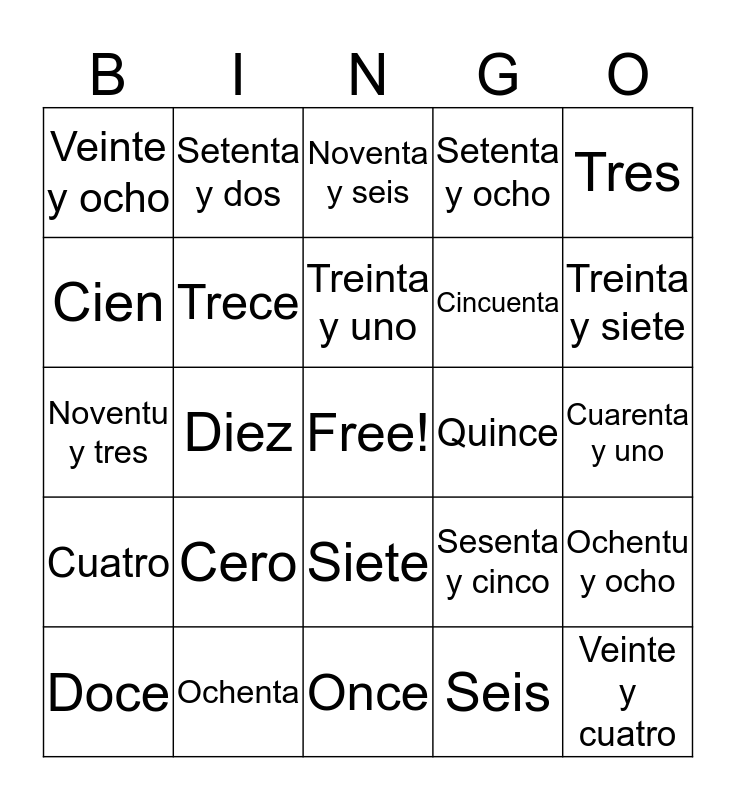 This bingo card has a free space and 24 words: Cero, Ochenta, Treinta y uno, Doce, Tres, Veinte y ocho, Cien, Setenta y dos, Quince, Siete, Cincuenta, Noventu y tres, Sesenta y cinco, Ochentu y ocho, Trece, Seis, Cuarenta y uno, Noventa y seis, Treinta y siete, Diez, Veinte y cuatro, Cuatro, Setenta y ocho and Once.
