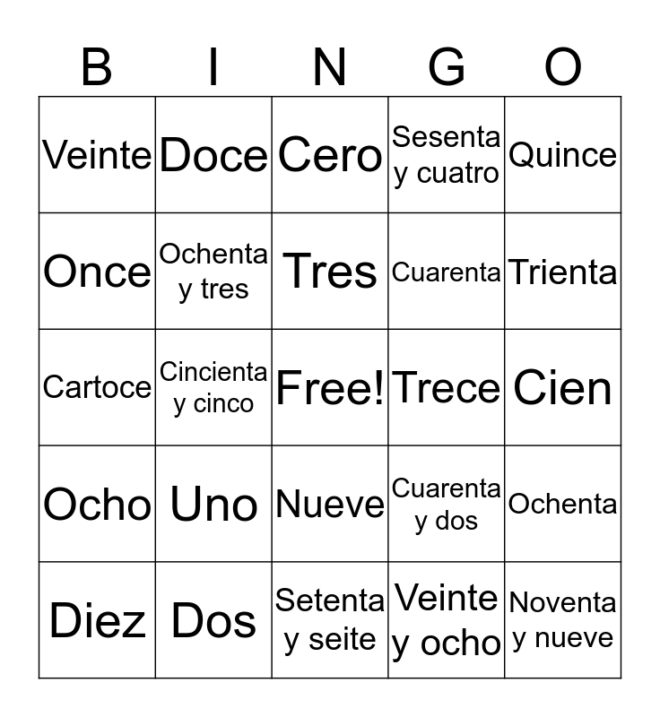 This bingo card has a free space and 24 words: Uno, Dos, Tres, Diez, Quince, Veinte, Once, Doce, Trece, Nueve, Cuarenta, Cartoce, Cuarenta y dos, Ochenta, Ochenta y tres, Veinte y ocho, Cien, Cero, Trienta, Cincienta y cinco, Noventa y nueve, Ocho, Sesenta y cuatro and Setenta y seite.