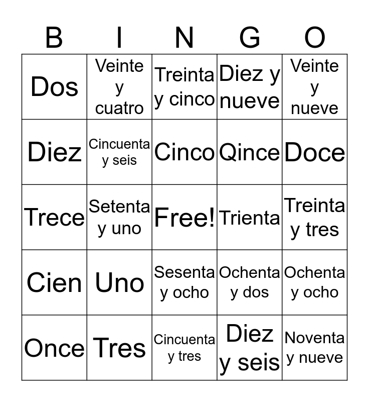 This bingo card has a free space and 24 words: Uno, Tres, Cinco, Once, Veinte y nueve, Dos, Diez, Veinte y cuatro, Trienta, Sesenta y ocho, Qince, Trece, Ochenta y dos, Ochenta y ocho, Cincuenta y seis, Diez y seis, Treinta y tres, Treinta y cinco, Doce, Setenta y uno, Noventa y nueve, Cien, Diez y nueve and Cincuenta y tres.
