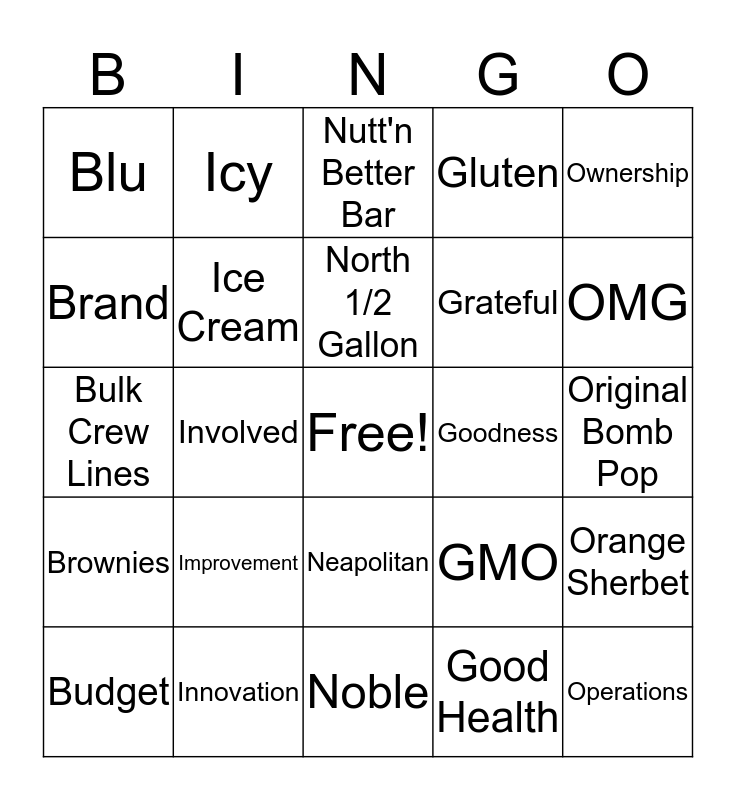 This bingo card has a free space and 24 words: Budget, Improvement, North 1/2 Gallon, Good Health, Ownership, Blu, Icy, Nutt'n Better Bar, Goodness, Original Bomb Pop, Bulk Crew Lines, Ice Cream, GMO, Orange Sherbet, Brand, Innovation, Noble, Gluten, OMG, Brownies, Involved, Neapolitan, Grateful and Operations.