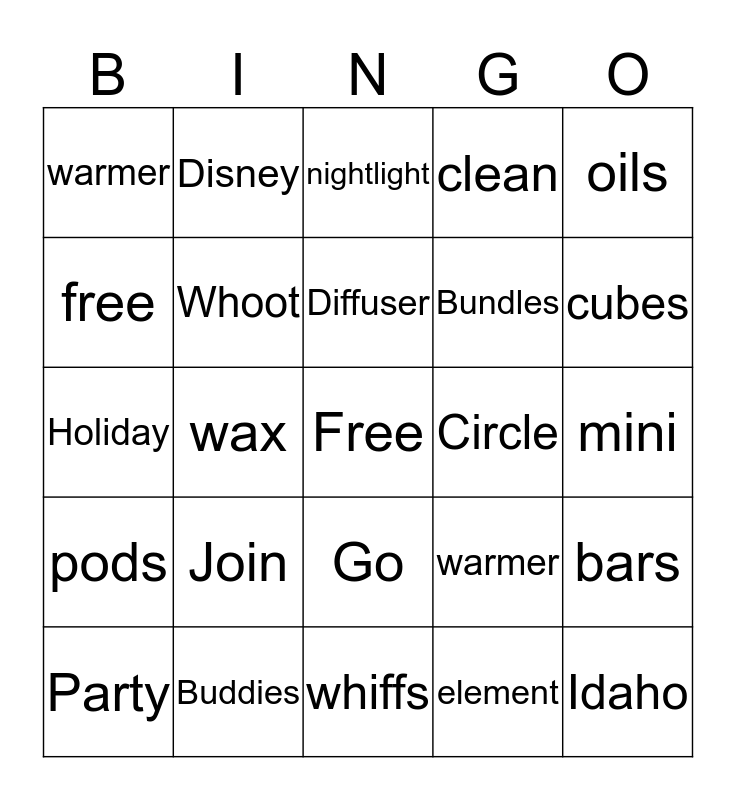 This bingo card has a free space and 24 words: Join, Buddies, Diffuser, Party, oils, warmer, free, Disney, Circle, Go, Bundles, Holiday, warmer, bars, Whoot, element, mini, nightlight, cubes, wax, Idaho, pods, clean and whiffs.