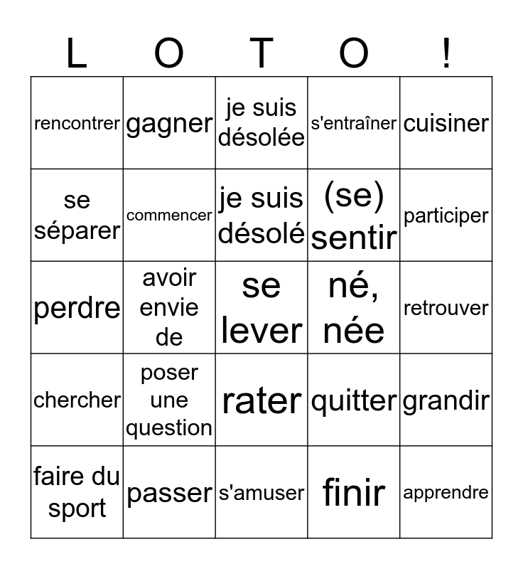 This bingo card has 33 words: apprendre, attendre, avoir envie de, avoir peur (de), chercher, commencer, cuisiner, faire du sport, gagner, inviter, je suis désolé, je suis désolée, jouer, montrer, né, née, participer, passer, perdre, poser une question, quitter, rater, regarder la télé, rencontrer, retrouver, s'amuser, se lever, s'entraîner, (se) sentir, se séparer, grandir, choisir, finir and réussir.