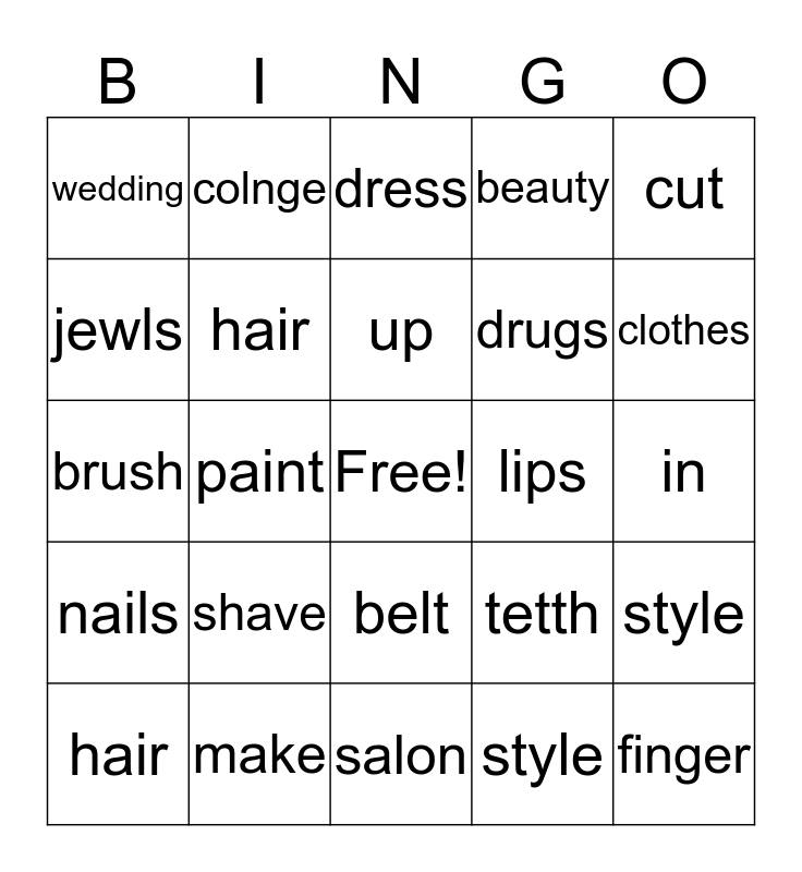 This bingo card has a free space and 24 words: shave, make, up, hair, cut, wedding, jewls, colnge, lips, belt, drugs, brush, tetth, style, hair, style, in, dress, clothes, paint, finger, nails, beauty and salon.