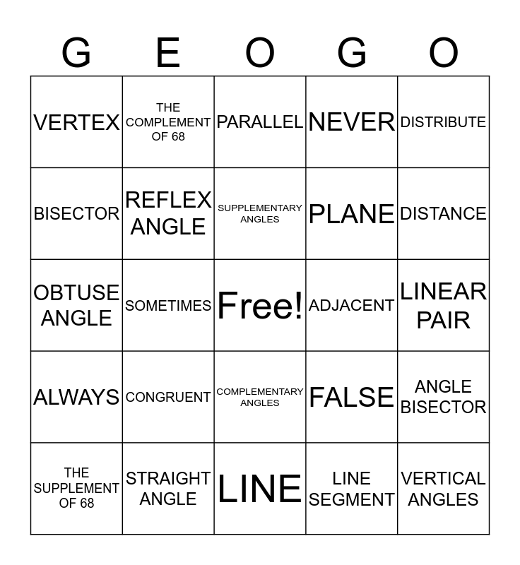 This bingo card has a free space and 41 words: ACUTE ANGLE, OBTUSE ANGLE, RIGHT ANGLE, REFLEX ANGLE, STRAIGHT ANGLE, COMPLEMENTARY ANGLES, SUPPLEMENTARY ANGLES, ORDER OF OPERATION, DISTRIBUTE, ALWAYS, SOMETIMES, NEVER, VERTICAL ANGLES, LINEAR PAIR, ADJACENT, CONGRUENT, RAY, VERTEX, PERPENDICULAR, PARALLEL, ANGLE BISECTOR, POINT, LINE, PLANE, COLLINEAR, COPLANAR, LINE SEGMENT, RAY, DISTANCE, POSITIVE, NEGATIVE, THE COMPLEMENT OF 68, THE SUPPLEMENT OF 68, TRUE, FALSE, BISECTOR, SUM, DIFFERENCE, PRODUCT, QUOTIENT and GEMDAS (GEMA).