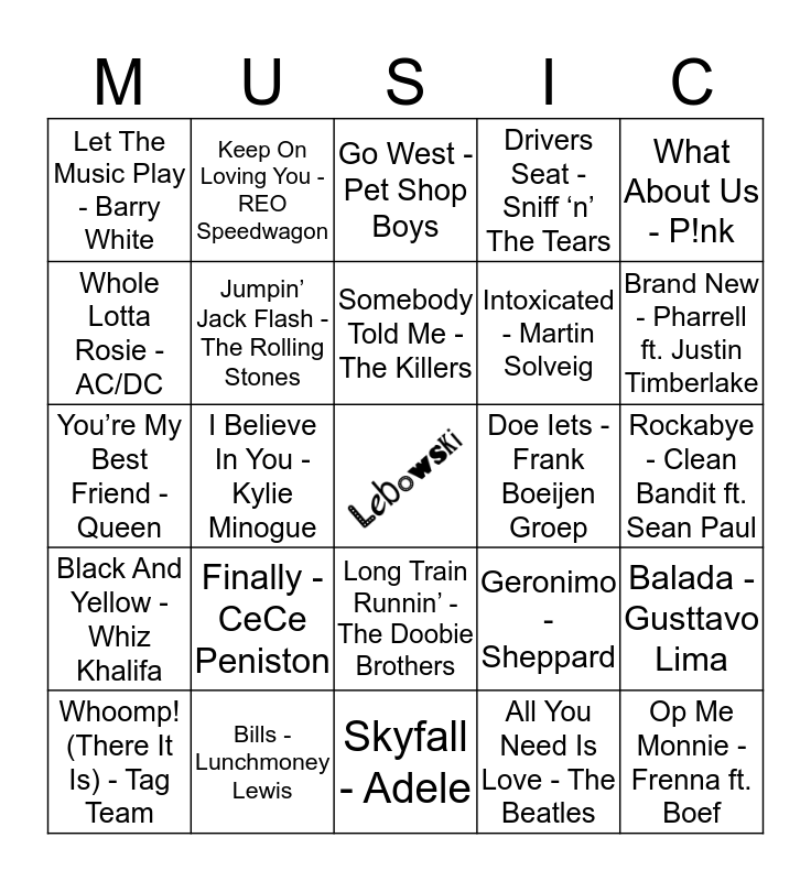 This bingo card has a free space and 24 words: Finally - CeCe Peniston, Bills - Lunchmoney Lewis, Somebody Told Me - The Killers, Whoomp! (There It Is) - Tag Team, What About Us - P!nk, Let The Music Play - Barry White, Whole Lotta Rosie - AC/DC, Keep On Loving You - REO Speedwagon, Doe Iets - Frank Boeijen Groep, Long Train Runnin’ - The Doobie Brothers, Intoxicated - Martin Solveig, You’re My Best Friend - Queen, Geronimo - Sheppard, Balada - Gusttavo Lima, Jumpin’ Jack Flash - The Rolling Stones, All You Need Is Love - The Beatles, Rockabye - Clean Bandit ft. Sean Paul, Go West - Pet Shop Boys, Brand New - Pharrell ft. Justin Timberlake, I Believe In You - Kylie Minogue, Op Me Monnie - Frenna ft. Boef, Black And Yellow - Whiz Khalifa, Drivers Seat - Sniff ‘n’ The Tears and Skyfall - Adele.