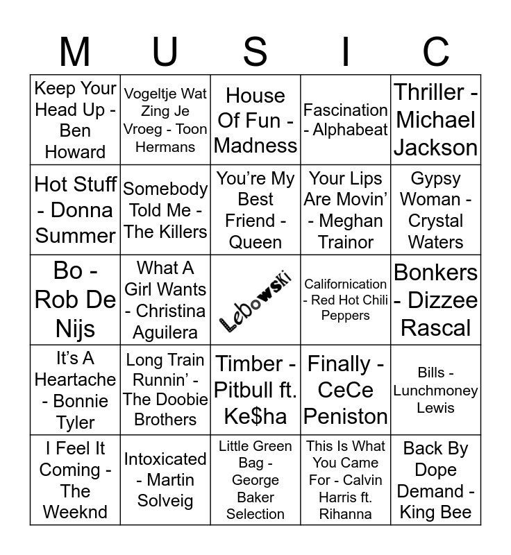 This bingo card has a free space and 24 words: Long Train Runnin’ - The Doobie Brothers, Intoxicated - Martin Solveig, You’re My Best Friend - Queen, I Feel It Coming - The Weeknd, Thriller - Michael Jackson, Keep Your Head Up - Ben Howard, Hot Stuff - Donna Summer, Vogeltje Wat Zing Je Vroeg - Toon Hermans, Californication - Red Hot Chili Peppers, Timber - Pitbull ft. Ke$ha, Your Lips Are Movin’ - Meghan Trainor, Bo - Rob De Nijs, Finally - CeCe Peniston, Bills - Lunchmoney Lewis, Somebody Told Me - The Killers, This Is What You Came For - Calvin Harris ft. Rihanna, Bonkers - Dizzee Rascal, House Of Fun - Madness, Gypsy Woman - Crystal Waters, What A Girl Wants - Christina Aguilera, Back By Dope Demand - King Bee, It’s A Heartache - Bonnie Tyler, Fascination - Alphabeat and Little Green Bag - George Baker Selection.