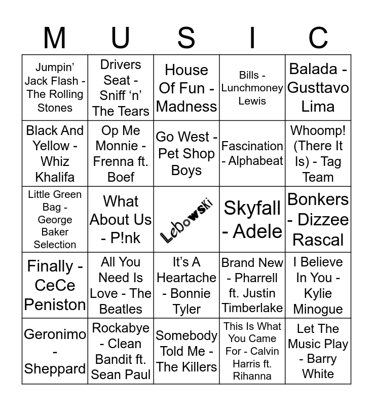 This bingo card has a free space and 24 words: All You Need Is Love - The Beatles, Rockabye - Clean Bandit ft. Sean Paul, Go West - Pet Shop Boys, Geronimo - Sheppard, Balada - Gusttavo Lima, Jumpin’ Jack Flash - The Rolling Stones, Black And Yellow - Whiz Khalifa, Drivers Seat - Sniff ‘n’ The Tears, Skyfall - Adele, It’s A Heartache - Bonnie Tyler, Fascination - Alphabeat, Little Green Bag - George Baker Selection, Brand New - Pharrell ft. Justin Timberlake, I Believe In You - Kylie Minogue, Op Me Monnie - Frenna ft. Boef, This Is What You Came For - Calvin Harris ft. Rihanna, Bonkers - Dizzee Rascal, House Of Fun - Madness, Whoomp! (There It Is) - Tag Team, What About Us - P!nk, Let The Music Play - Barry White, Finally - CeCe Peniston, Bills - Lunchmoney Lewis and Somebody Told Me - The Killers.