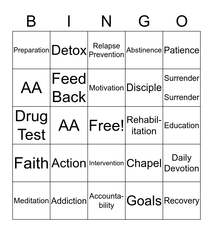 This bingo card has a free space and 24 words: Action, Addiction, Motivation, Meditation, Patience, Preparation, AA, Detox, Rehabil-itation, Intervention, Disciple, Drug Test, Chapel, Daily Devotion, Feed Back, Goals, Education, Relapse Prevention, Surrender Surrender, AA, Recovery, Faith, Abstinence and Accounta-bility.