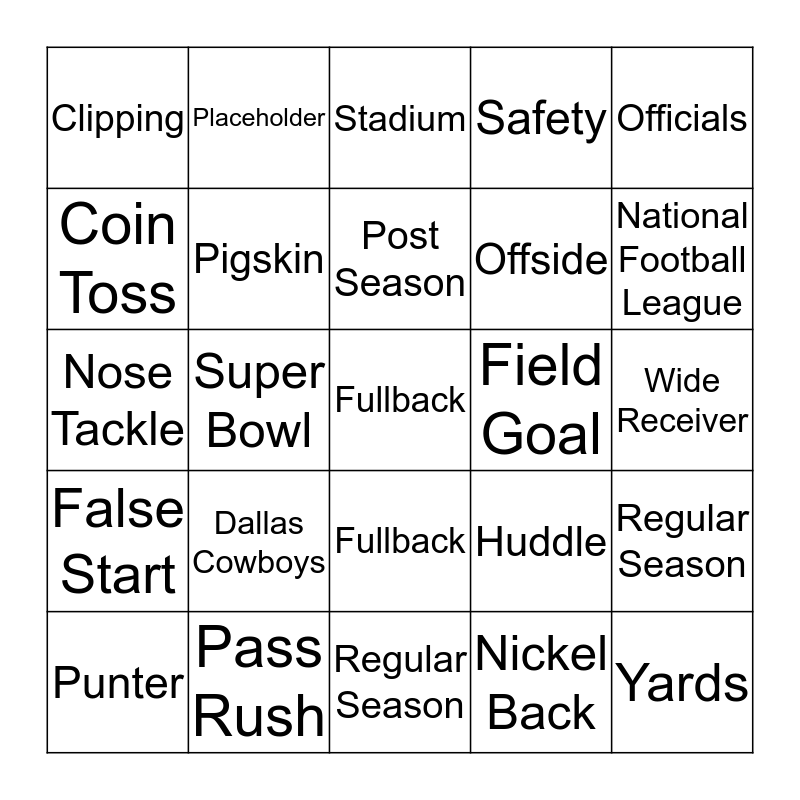 This bingo card has 25 words: Dallas Cowboys, Regular Season, Post Season, Punter, Officials, Clipping, Coin Toss, Placeholder, Field Goal, Fullback, Offside, Nose Tackle, Huddle, Regular Season, Pigskin, Yards, Wide Receiver, Stadium, National Football League, Super Bowl, Fullback, Pass Rush, False Start, Safety and Nickel Back.