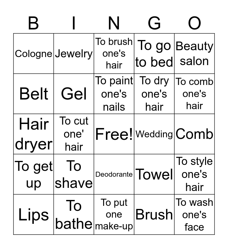 This bingo card has a free space and 24 words: To shave, To bathe, To paint one's nails, Lips, Beauty salon, Cologne, Belt, Jewelry, Wedding, Deodorante, To dry one's hair, Hair dryer, Towel, To style one's hair, Gel, Brush, Comb, To brush one's hair, To comb one's hair, To cut one' hair, To wash one's face, To get up, To go to bed and To put one make-up.