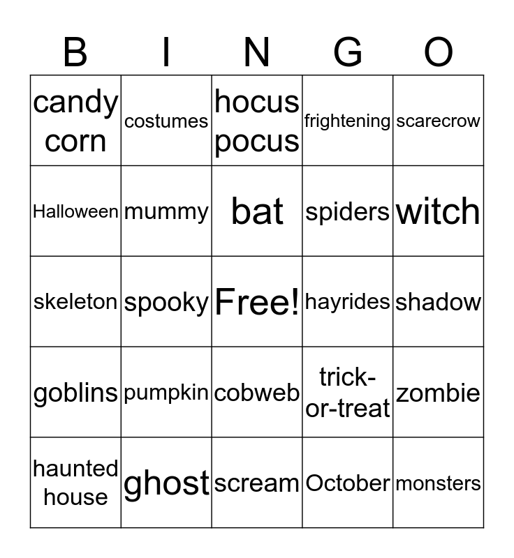 This bingo card has a free space and 24 words: pumpkin, ghost, bat, haunted house, scarecrow, candy corn, Halloween, costumes, hayrides, cobweb, spiders, skeleton, trick-or-treat, zombie, mummy, October, shadow, hocus pocus, witch, spooky, monsters, goblins, frightening and scream.