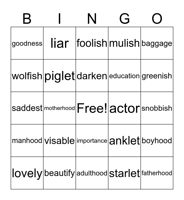 This bingo card has a free space and 24 words: visable, beautify, darken, lovely, baggage, goodness, wolfish, liar, actor, importance, education, saddest, anklet, boyhood, piglet, starlet, snobbish, foolish, greenish, motherhood, fatherhood, manhood, mulish and adulthood.