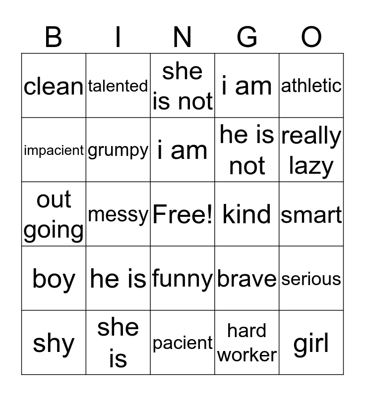 This bingo card has a free space and 24 words: he is, she is, i am, shy, athletic, clean, impacient, talented, kind, funny, he is not, out going, brave, serious, grumpy, hard worker, smart, she is not, really lazy, messy, girl, boy, i am and pacient.