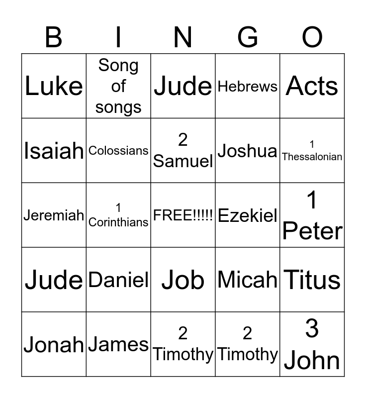 This bingo card has a free space and 24 words: Daniel, James, 2 Samuel, Jonah, Acts, Luke, Isaiah, Song of songs, Ezekiel, Job, Joshua, Jeremiah, Micah, Titus, Colossians, 2 Timothy, 1 Peter, Jude, 1 Thessalonian, 1 Corinthians, 3 John, Jude, Hebrews and 2 Timothy.