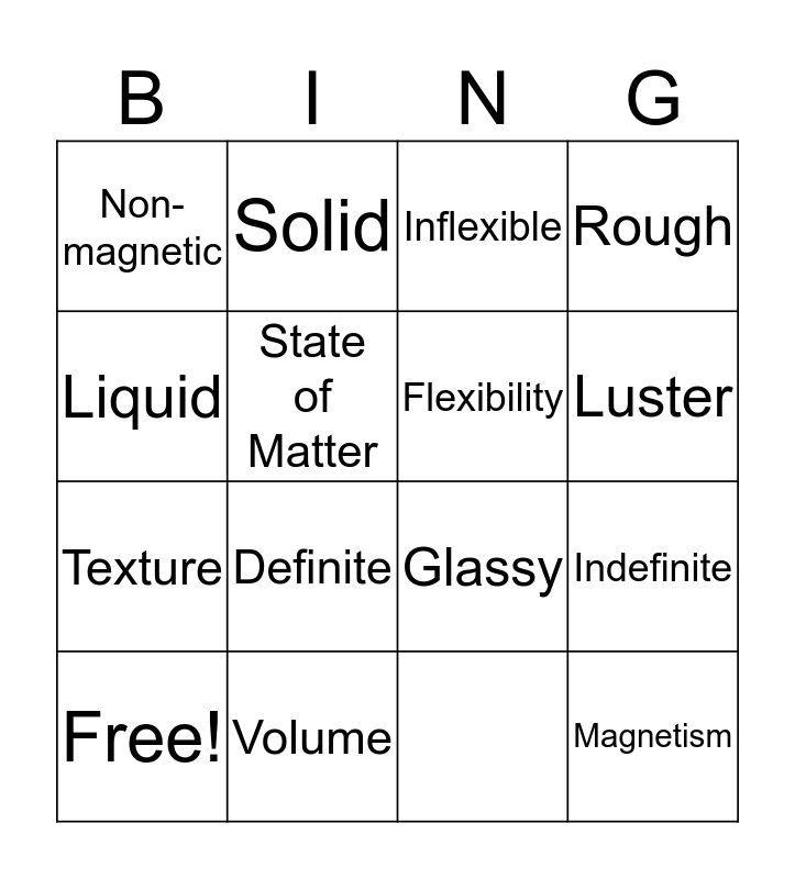 This bingo card has 16 words: Texture, Transparent, Flexibility, Rough, Volume, Inflexible, Magnetism, Free!, State of Matter, Luster, Liquid, Solid, Indefinite, Non-magnetic, Definite and Glassy.