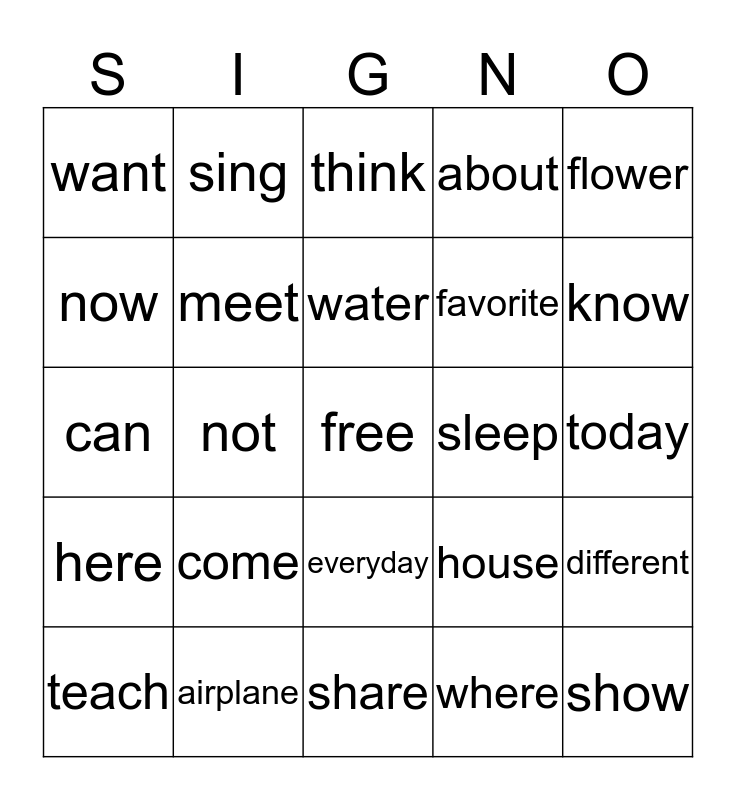 This bingo card has a free space and 24 words: come, airplane, water, teach, flower, want, now, sing, sleep, everyday, favorite, can, house, different, meet, where, today, think, know, not, show, here, about and share.