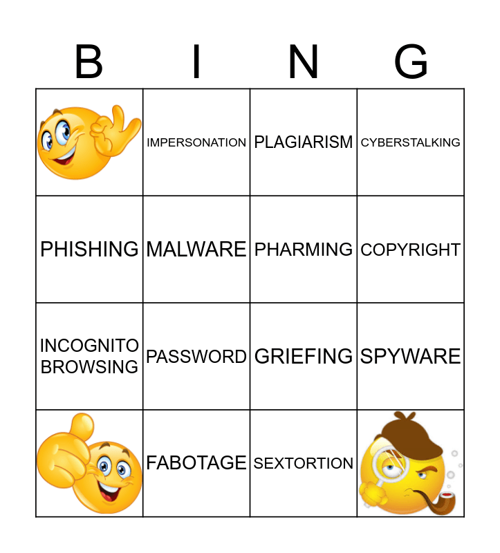 This bingo card has 4 images and 17 words: FLAMING, IMPERSONATION, PLAGIARISM, CYBERSTALKING, PHISHING, MALWARE, SEXTORTION, COPYRIGHT, CREEPING, FABOTAGE, GRIEFING, HACKER, INCOGNITO BROWSING, PASSWORD, PHARMING, SPYWARE and TROLL.