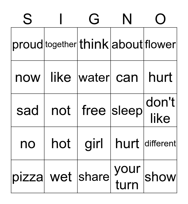 This bingo card has a free space and 24 words: hot, wet, water, pizza, flower, proud, now, together, sleep, girl, can, sad, hurt, different, like, your turn, don't like, think, hurt, not, show, no, about and share.