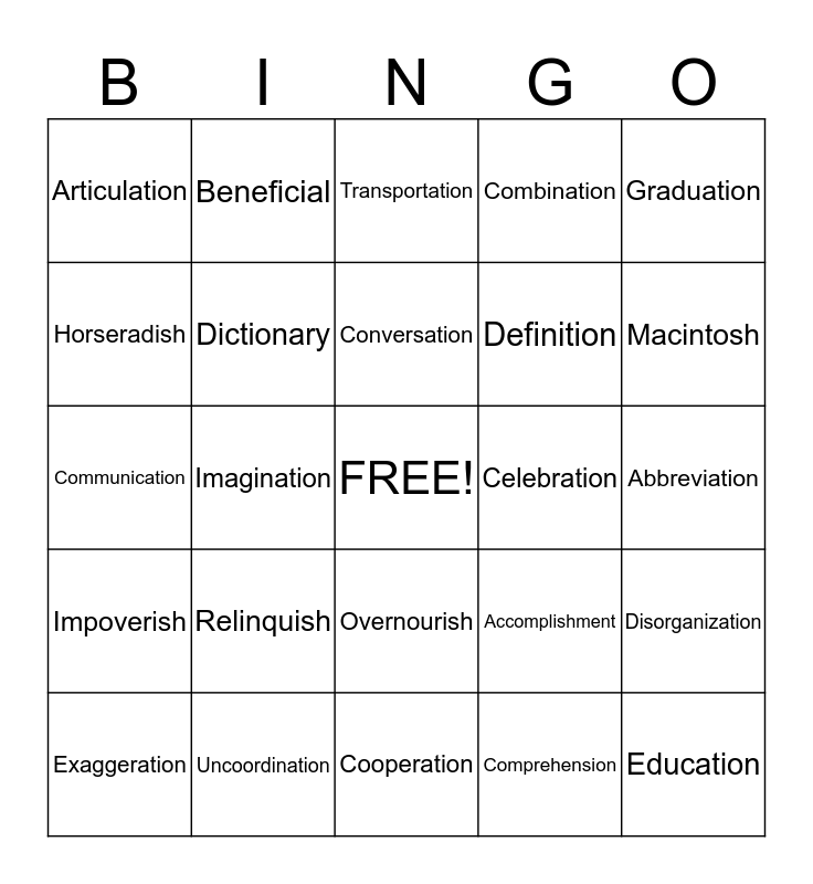 This bingo card has a free space and 24 words: Relinquish, Uncoordination, Conversation, Exaggeration, Graduation, Articulation, Horseradish, Beneficial, Celebration, Overnourish, Definition, Communication, Accomplishment, Disorganization, Dictionary, Comprehension, Abbreviation, Transportation, Macintosh, Imagination, Education, Impoverish, Combination and Cooperation.