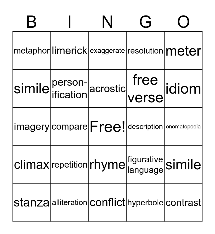This bingo card has a free space and 24 words: repetition, alliteration, acrostic, stanza, meter, metaphor, simile, limerick, description, rhyme, free verse, imagery, figurative language, simile, person-ification, hyperbole, onomatopoeia, exaggerate, idiom, compare, contrast, climax, resolution and conflict.