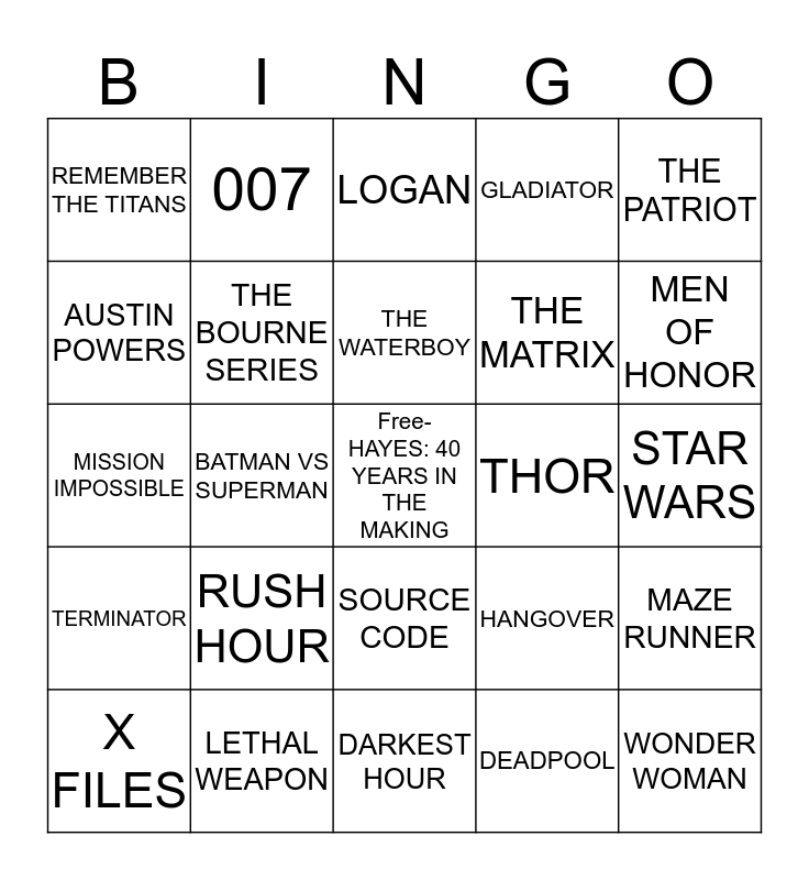 This bingo card has a free space and 24 words: RUSH HOUR, LETHAL WEAPON, THE WATERBOY, X FILES, THE PATRIOT, REMEMBER THE TITANS, AUSTIN POWERS, 007, THOR, SOURCE CODE, THE MATRIX, MISSION IMPOSSIBLE, HANGOVER, MAZE RUNNER, THE BOURNE SERIES, DEADPOOL, STAR WARS, LOGAN, MEN OF HONOR, BATMAN VS SUPERMAN, WONDER WOMAN, TERMINATOR, GLADIATOR and DARKEST HOUR.