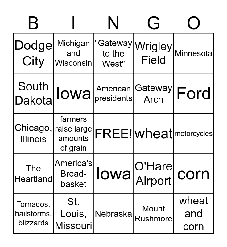 This bingo card has a free space and 24 words: America's Bread-basket, St. Louis, Missouri, American presidents, Tornados, hailstorms, blizzards, Minnesota, Dodge City, South Dakota, Michigan and Wisconsin, wheat, Iowa, Gateway Arch, Chicago, Illinois, O'Hare Airport, corn, Iowa, Mount Rushmore, motorcycles, "Gateway to the West", Ford, farmers raise large amounts of grain, wheat and corn, The Heartland, Wrigley Field and Nebraska.