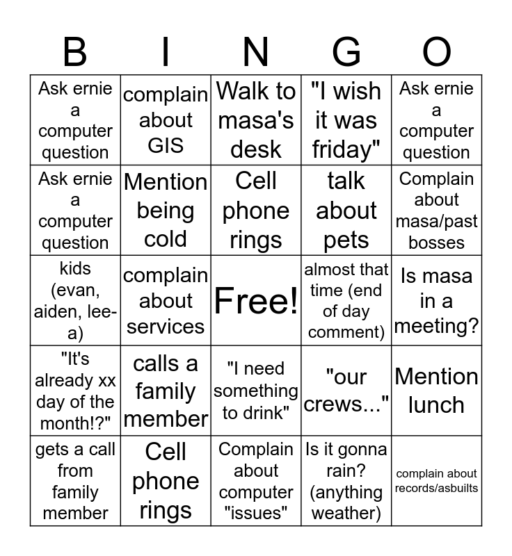 This bingo card has a free space and 24 words: calls a family member, Cell phone rings, Cell phone rings, gets a call from family member, Ask ernie a computer question, Ask ernie a computer question, Ask ernie a computer question, complain about GIS, almost that time (end of day comment), "I need something to drink", talk about pets, kids (evan, aiden, lee-a), "our crews...", Mention lunch, Mention being cold, Is it gonna rain? (anything weather), Is masa in a meeting?, Walk to masa's desk, Complain about masa/past bosses, complain about services, complain about records/asbuilts, "It's already xx day of the month!?", "I wish it was friday" and Complain about computer "issues".