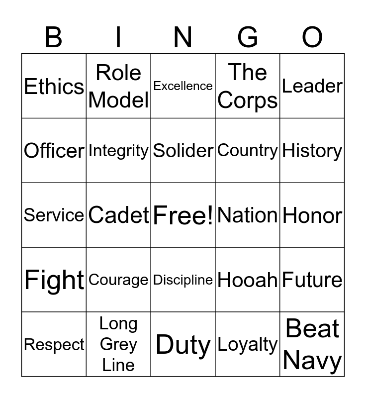 This bingo card has a free space and 24 words: Courage, Long Grey Line, Solider, Respect, Leader, Ethics, Officer, Role Model, Nation, Discipline, Country, Service, Hooah, Future, Integrity, Loyalty, Honor, Excellence, History, Cadet, Beat Navy, Fight, The Corps and Duty.