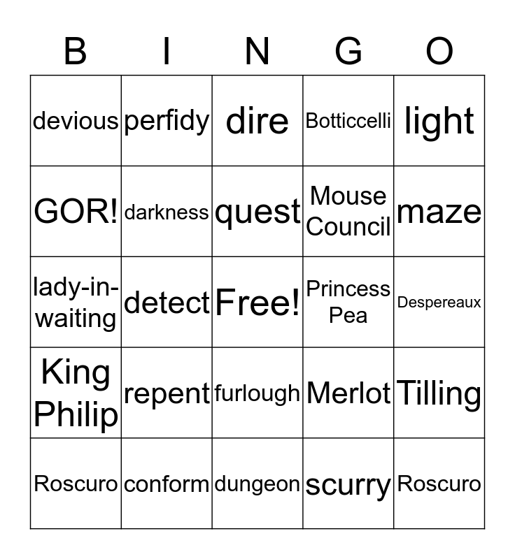This bingo card has a free space and 29 words: Roscuro, rodents, detect, emphatic, devious, dire, darkness, repent, Princess Pea, conform, Despereaux, Roscuro, dungeon, scurry, maze, hostility, furlough, King Philip, light, lady-in-waiting, Merlot, Tilling, Mouse Council, GOR!, Botticcelli, perfidy, Tilling, quest and Gregory.