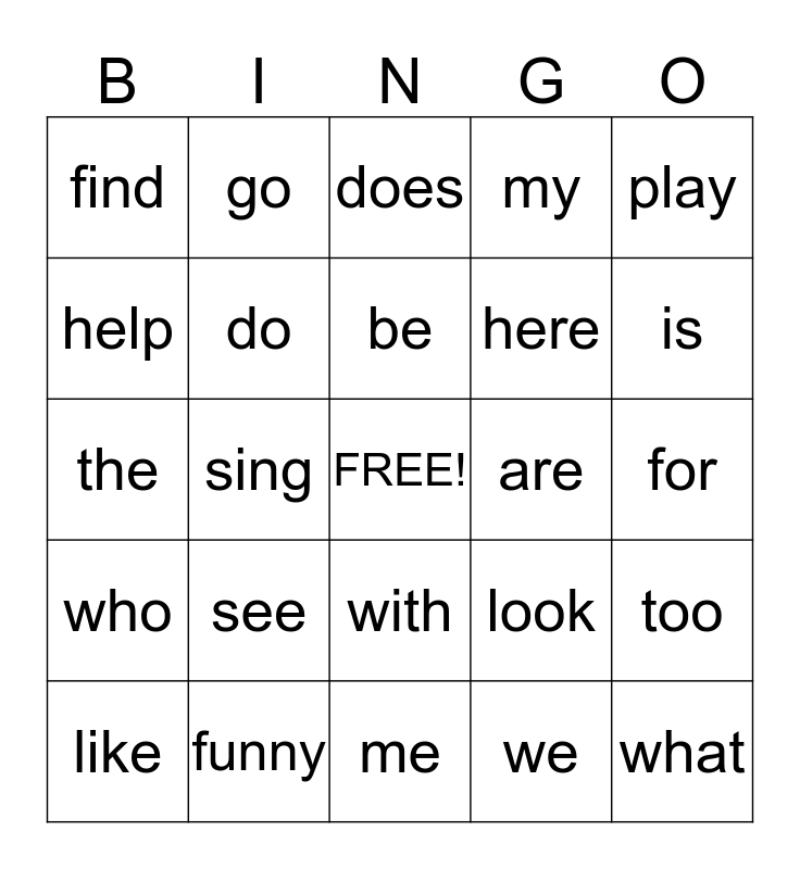 This bingo card has a free space and 24 words: see, funny, be, like, play, find, help, go, are, with, here, the, look, too, do, we, for, does, is, sing, what, who, my and me.