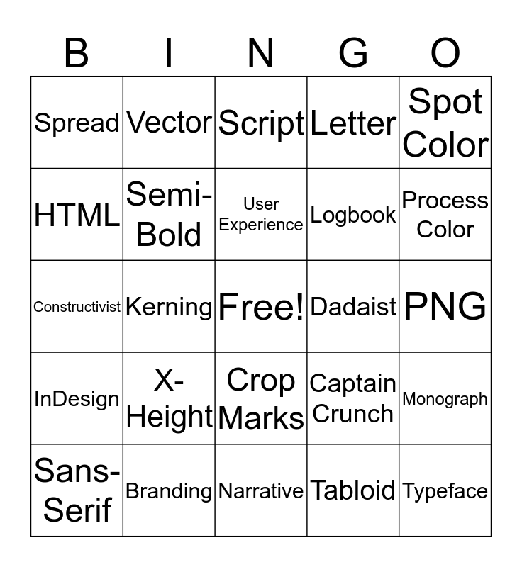 This bingo card has a free space and 75 words: Leading, Orphans, Script, Methodology, Pantone, Mark, Futurist, Bold, Vector, TIFF, Icon, Slack, User Experience, HTML, Outlines, Kerning, Widows, Typeface, Doritos, Spot Color, Grid, Constructivist, Semi-Bold, Vector, Letter, Style Guide, AIGA, Typography, CSS, Zine, Hierarchy, Serif, Body Copy, Captain Crunch, Process Color, Logbook, Full Bleed, Ligature, PNG, Tabloid, Photoshop, Artboard, Human Centered, Design Thinking, Xerox, Tracking, Sans-Serif, Spread, CMYK, Logo, Bauhaus, Crop Marks, Layers, PDF, Oversize Tabloid, Illustrator, Bezier Curve, Equity Centered, Concept, Risograph, X-Height, Slab-Serif, Alignment, RGB, Logotype, Dadaist, Oblique, Offset Printing, JPG, Monograph, InDesign, Branding, Design for Good, Narrative and OpenType.