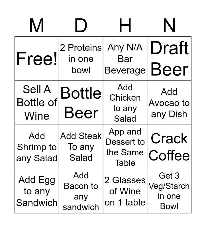 This bingo card has 16 words: Add Egg to any Sandwich, Add Bacon to any sandwich, Any N/A Bar Beverage, Draft Beer, Sell A Bottle of Wine, 2 Proteins in one bowl, App and Dessert to the Same Table, Crack Coffee, Free!, Bottle Beer, 2 Glasses of Wine on 1 table, Add Avocao to any Dish, Add Shrimp to any Salad, Add Steak To any Salad, Add Chicken to any Salad and Get 3 Veg/Starch in one Bowl.