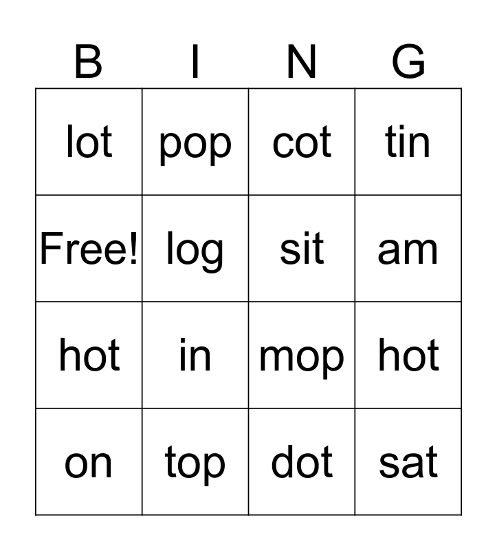 This bingo card has 16 words: top, hot, cot, lot, hot, pop, mop, dot, Free!, log, on, tin, in, am, sit and sat.